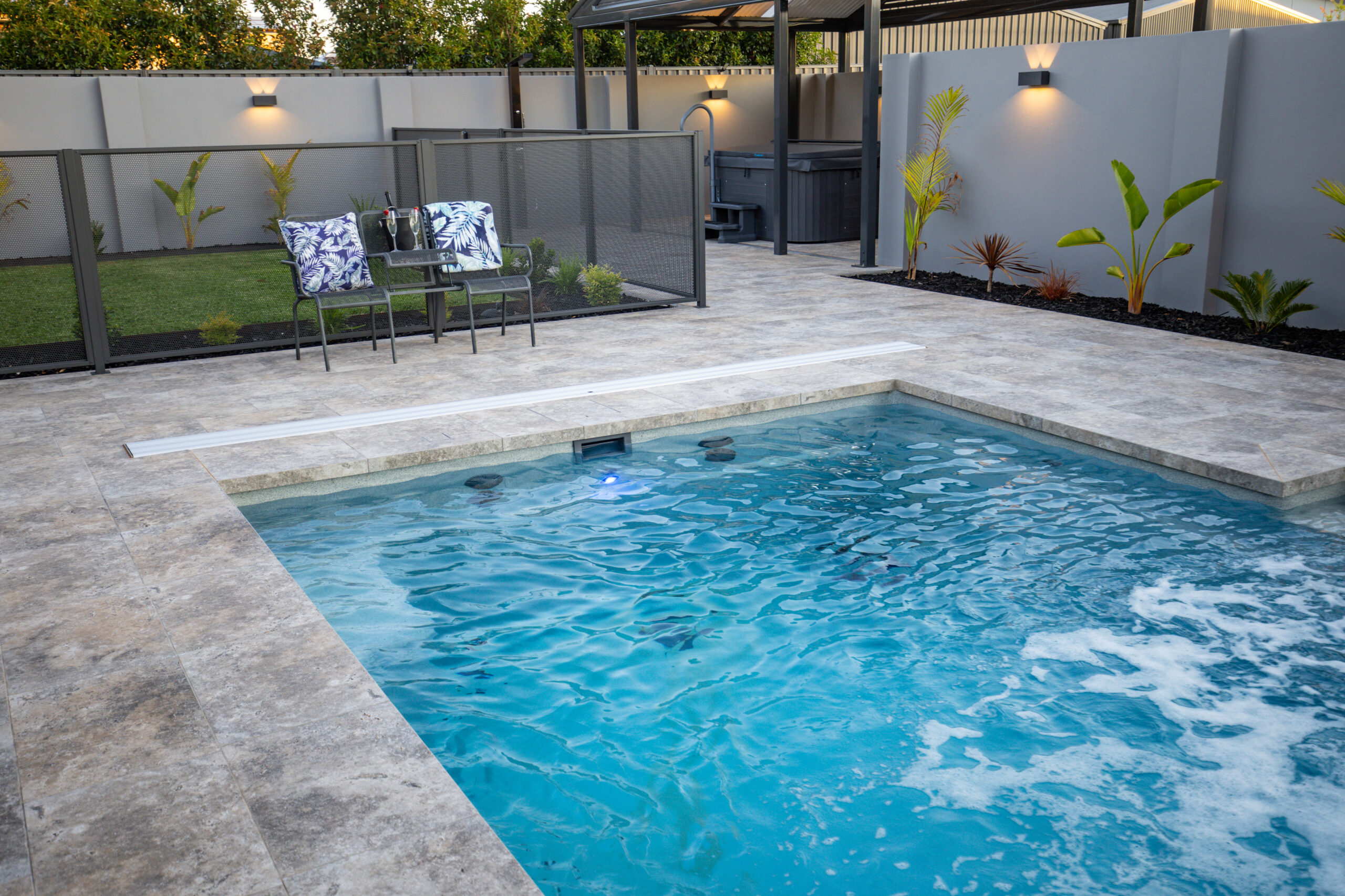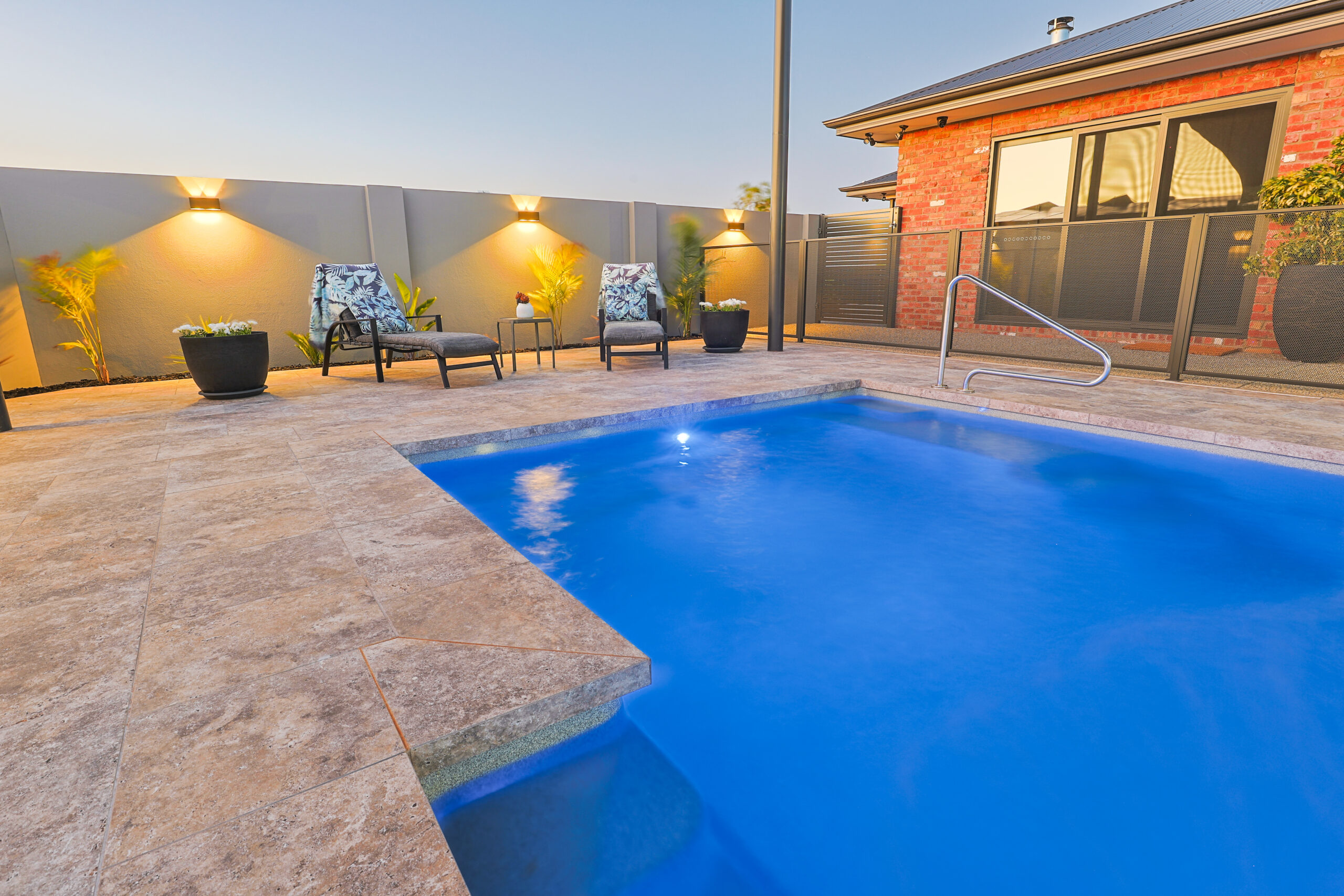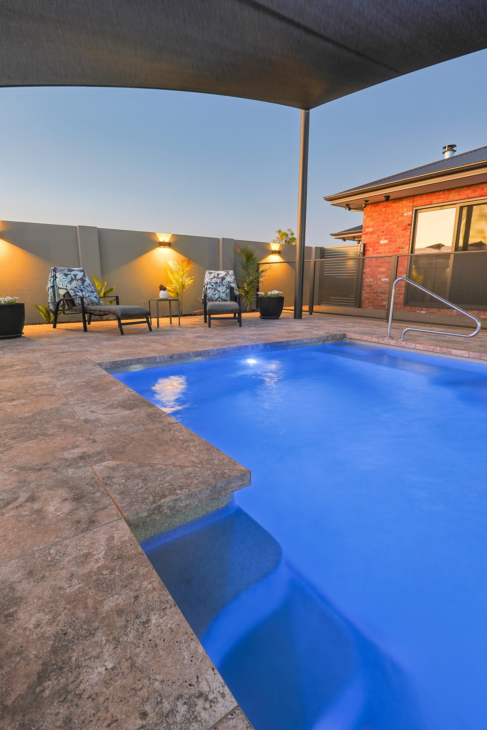 Pool Type: Compass Vogue fibreglass swimming pool, known for its sleek modern design, clean lines, and versatile layout that suits both relaxation and lap swimming.