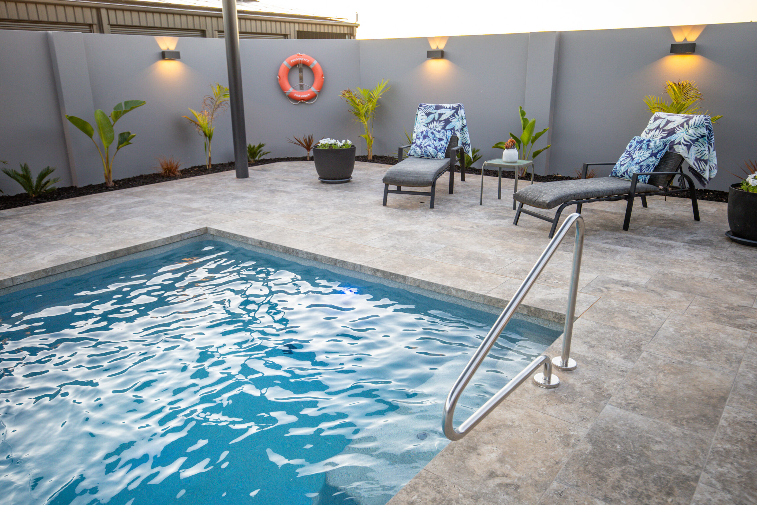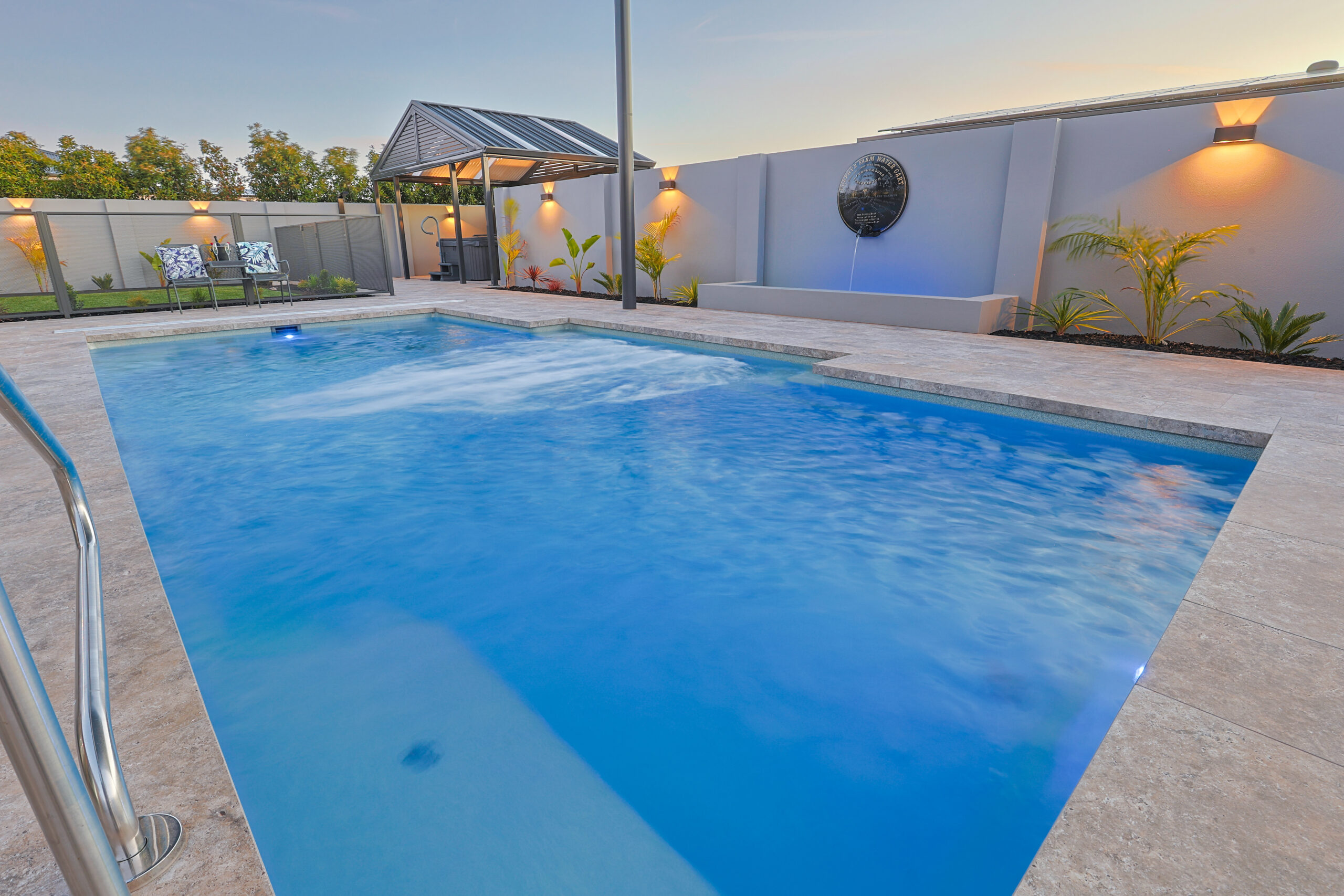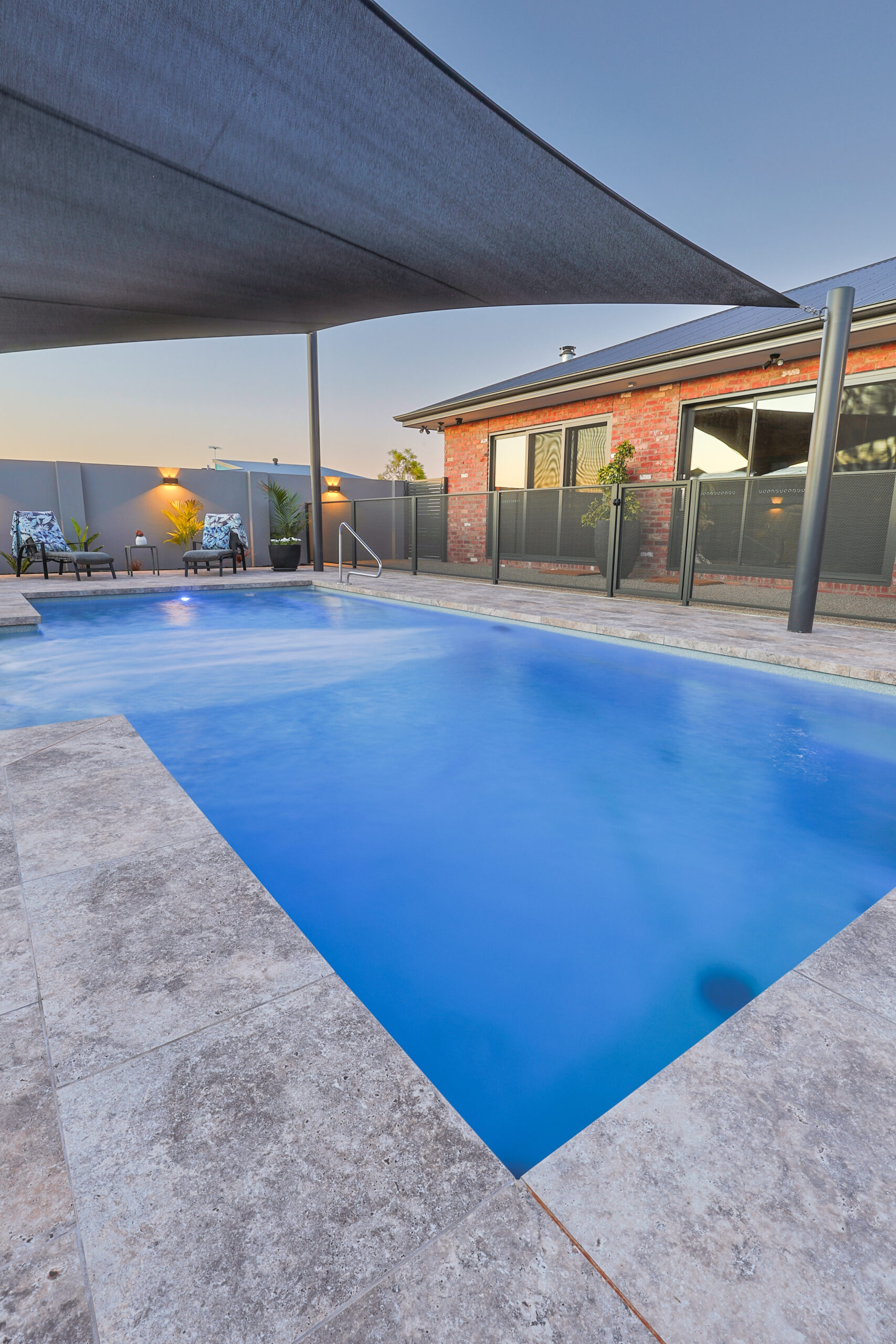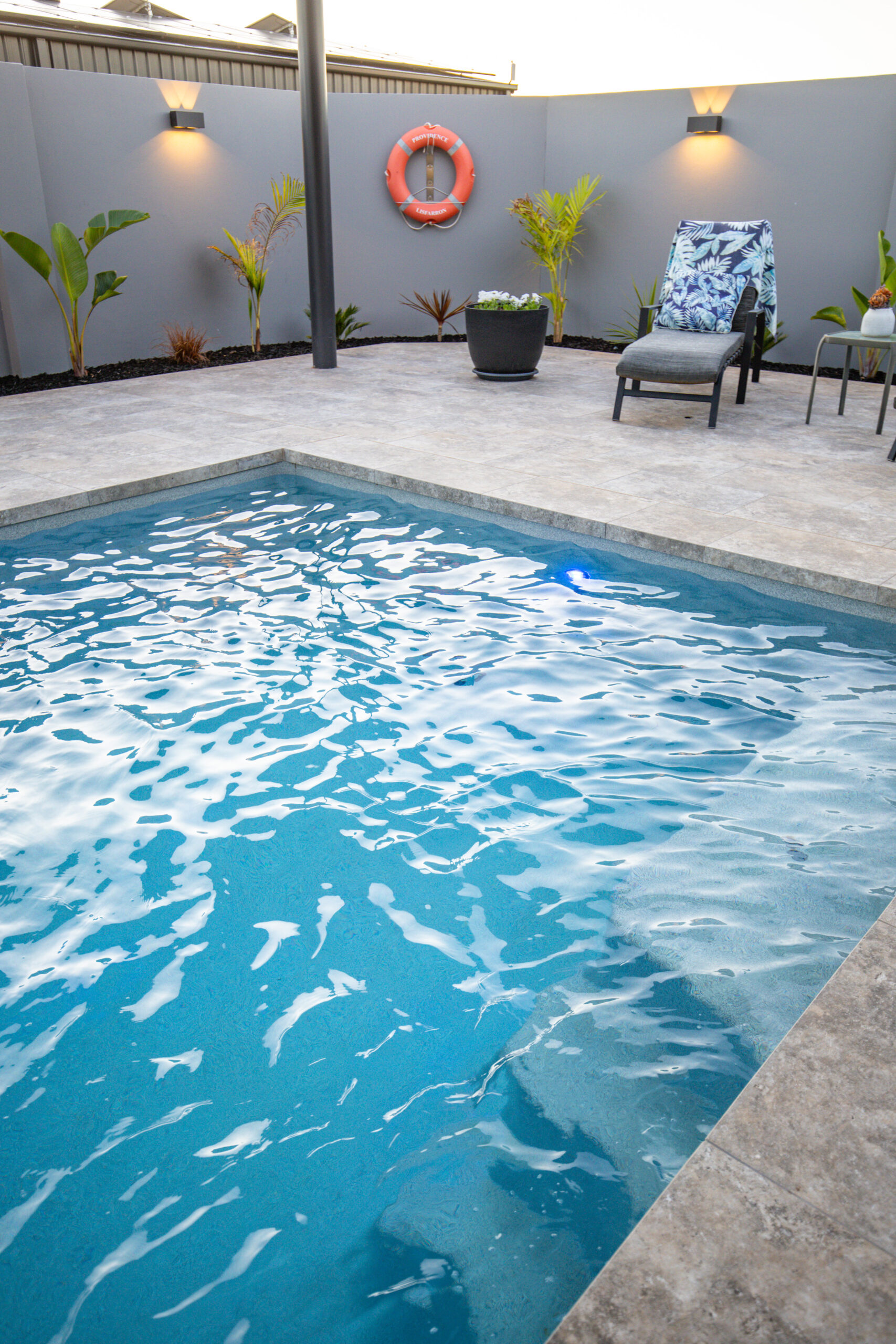 Pool Type: Compass Vogue fibreglass swimming pool, known for its sleek modern design, clean lines, and versatile layout that suits both relaxation and lap swimming.