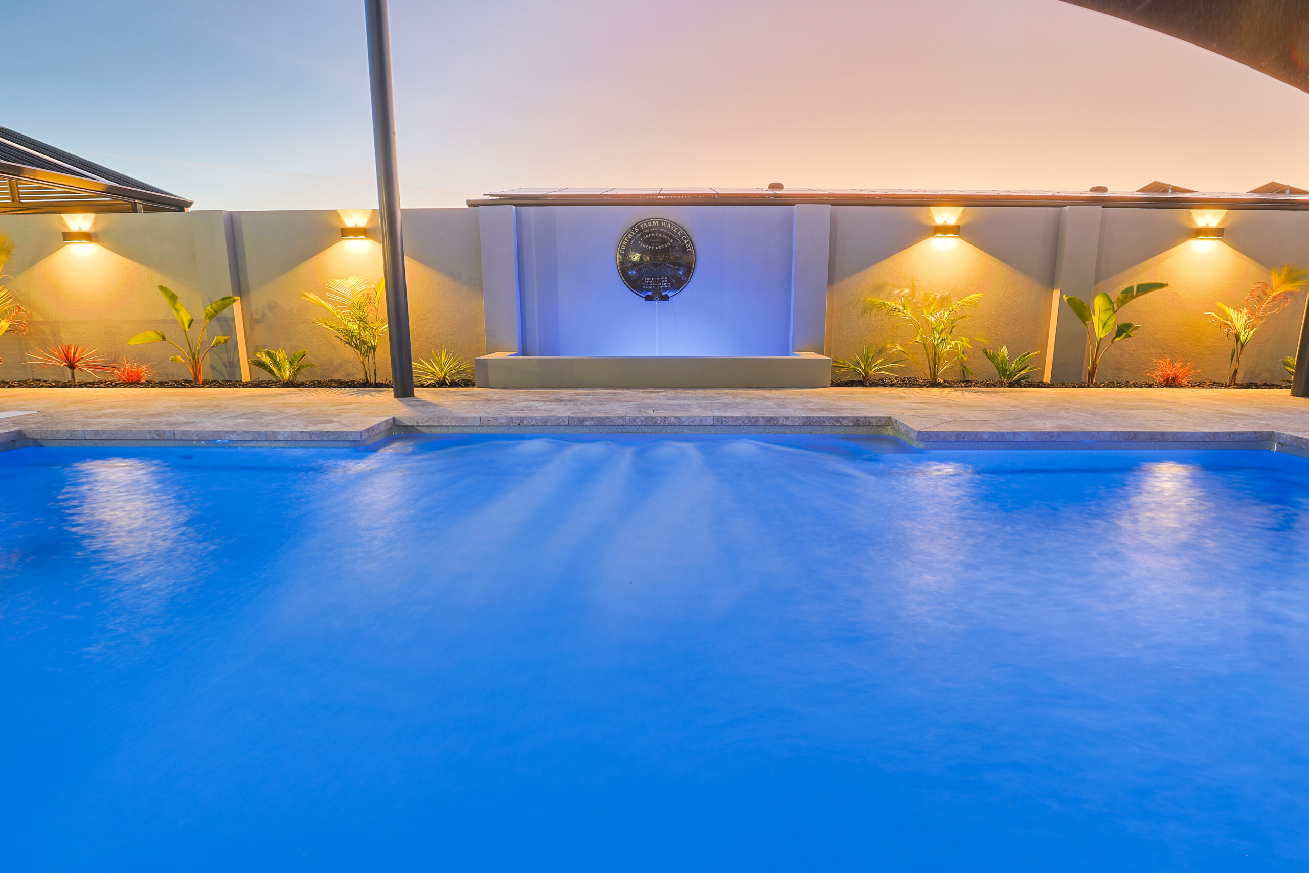 As evening approaches, carefully positioned lighting across the feature wall and within the pool transforms the entire area into a beautifully illuminated retreat, creating the perfect setting for relaxed evenings and outdoor entertaining.
